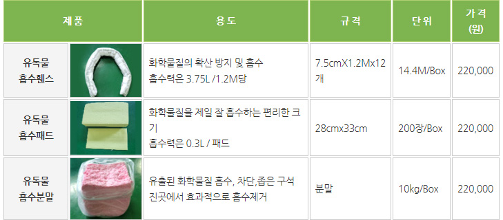 제 품 용 도 규 격 단 위 가 격 (원) 유독물 흡수휀스